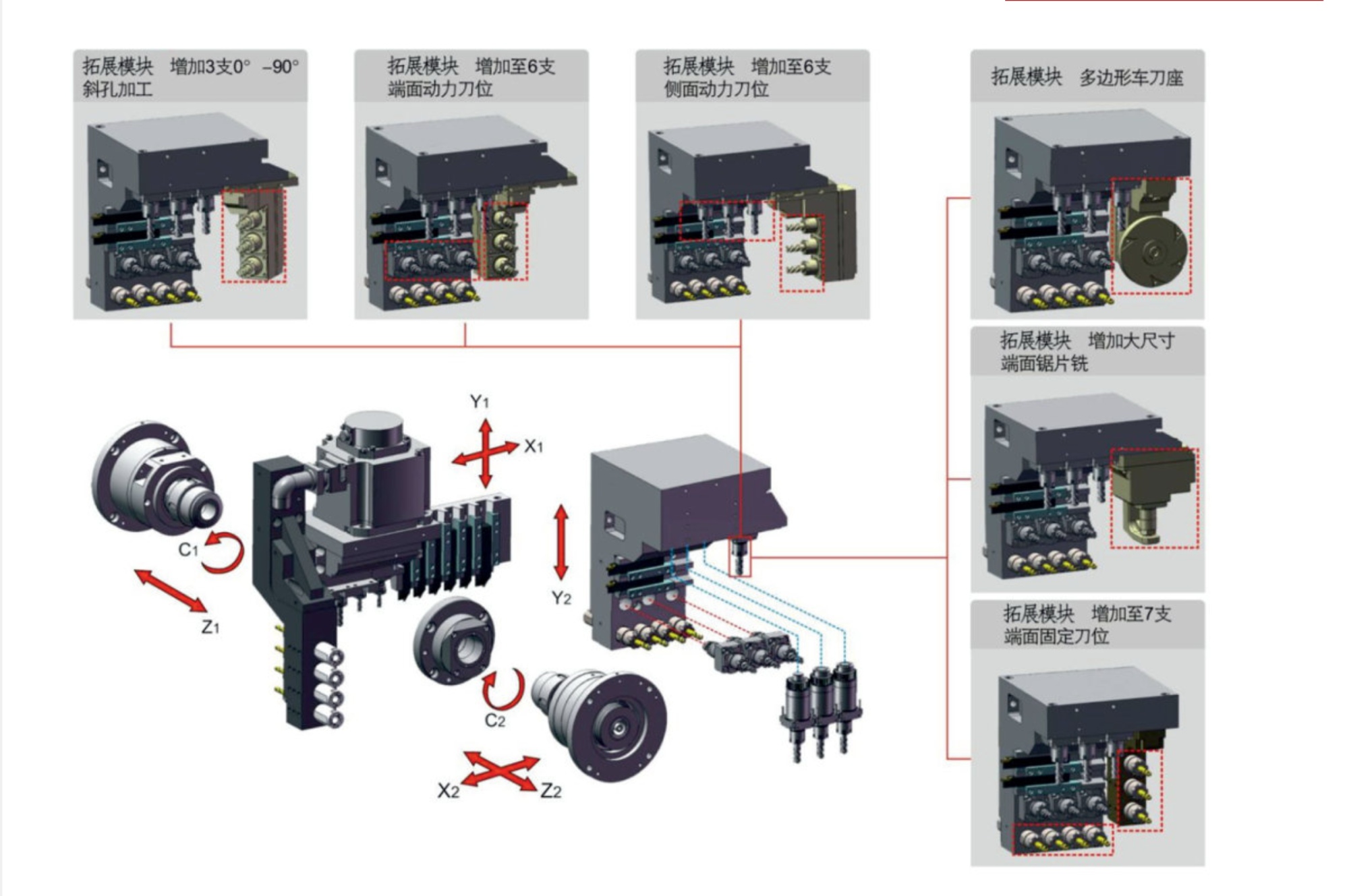 Обычный шестиосевой токарный станок стандартной конфигурации не имеет боковых вращающихся инструментов и предполагает расширение за счет сменных модулей. Сменные модули могут иметь только 1 позицию для установки с 1 поворотным инструментом, при этом они имеют высокую стоимость.